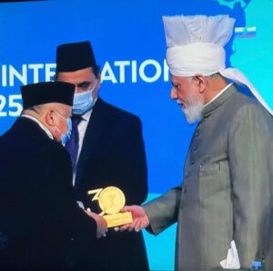 Bapak Kandali Achmad Lubis, Chairman Humanity First Indonesia menerima penghargaan dari Hz. Mirza Masroor Ahmad (aba) [Screenshoot tayangan MTA/Kaninda]